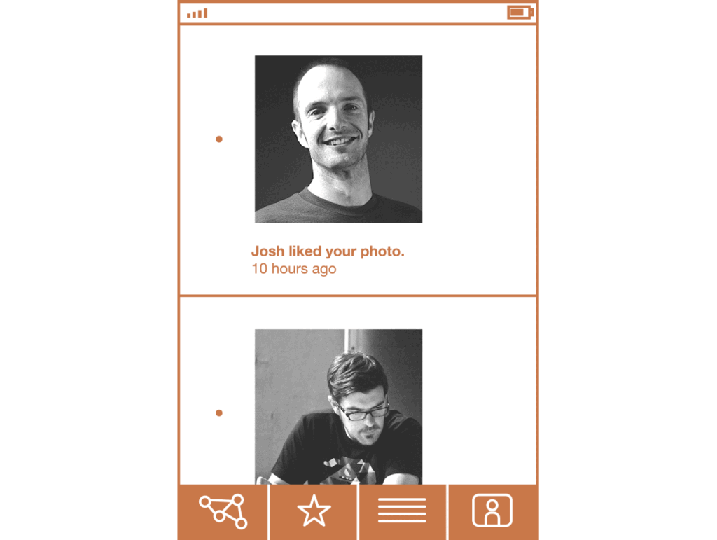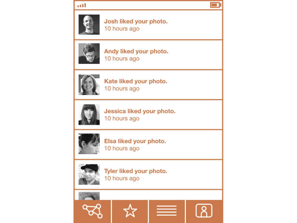 The story about Ogilvy and the blind beggar speaks to the consequences of when the personhood of an individual is amplified or minimized. The human presence changes behavior. Ogilvy created a space for empathy by telling a story, and I think that the decisions of a designer can influence whether or not users empathize with one another when huddled around a framework. Empathy is crucial in these cases, because frameworks are the means to build up things collaboratively. Let me give an example. A few weeks ago, I was using an application on my phone that is essentially a framework for sharing photos with friends. These friends can comment on the photos and favorite them. There is a screen in the application that lets you look at the updates describing who has liked a photo that you have taken, or if new people have shown up and subscribed to your stream of photos. The interface looks, roughly, something like this: