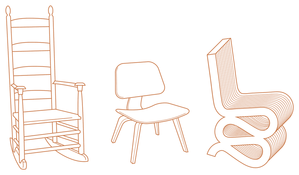 We have a multiplicity of chairs from three different designers: a tall rocking chair from the Shakers, a bent plywood seat from the Eames Office, and a curved chair made of cardboard by Frank Gehry. There are certain similarities and patterns in the chairs, because the objectives of the work act as a constraint on the process. They guide the designer to certain inevitable conclusions which are necessary to have the design fill the need it seeks to serve. Each chair has a seat, all form a cradle for the sitter, and all the chairs are of similar size that is based on the proportions of the human body. The constants of the designs are determined by the unavoidable logistical issues that must be addressed to make the design useful. A chair, for instance, must follow certain proportions to comfortably hold a human body.